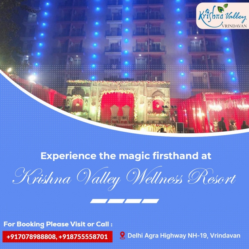 Unfold a tapestry of love and celebrations with intimate gatherings or grand receptions. From bridal showers and haldi ceremonies to mehndi and glitzy cocktail soirées, begin your journey of joy in Krishna Valley's Marriage Halls in Vrindavan. Nestled on the highway, our experiential holistic destination wellness resort is your urban escape, surrounded by 9 acres of lush greenery and divine amenities. Overlooking the spiritual town, the birthplace of Lord Sri Krishna, our serene property is dotted with temples, inviting you to find solace and seek blessings.